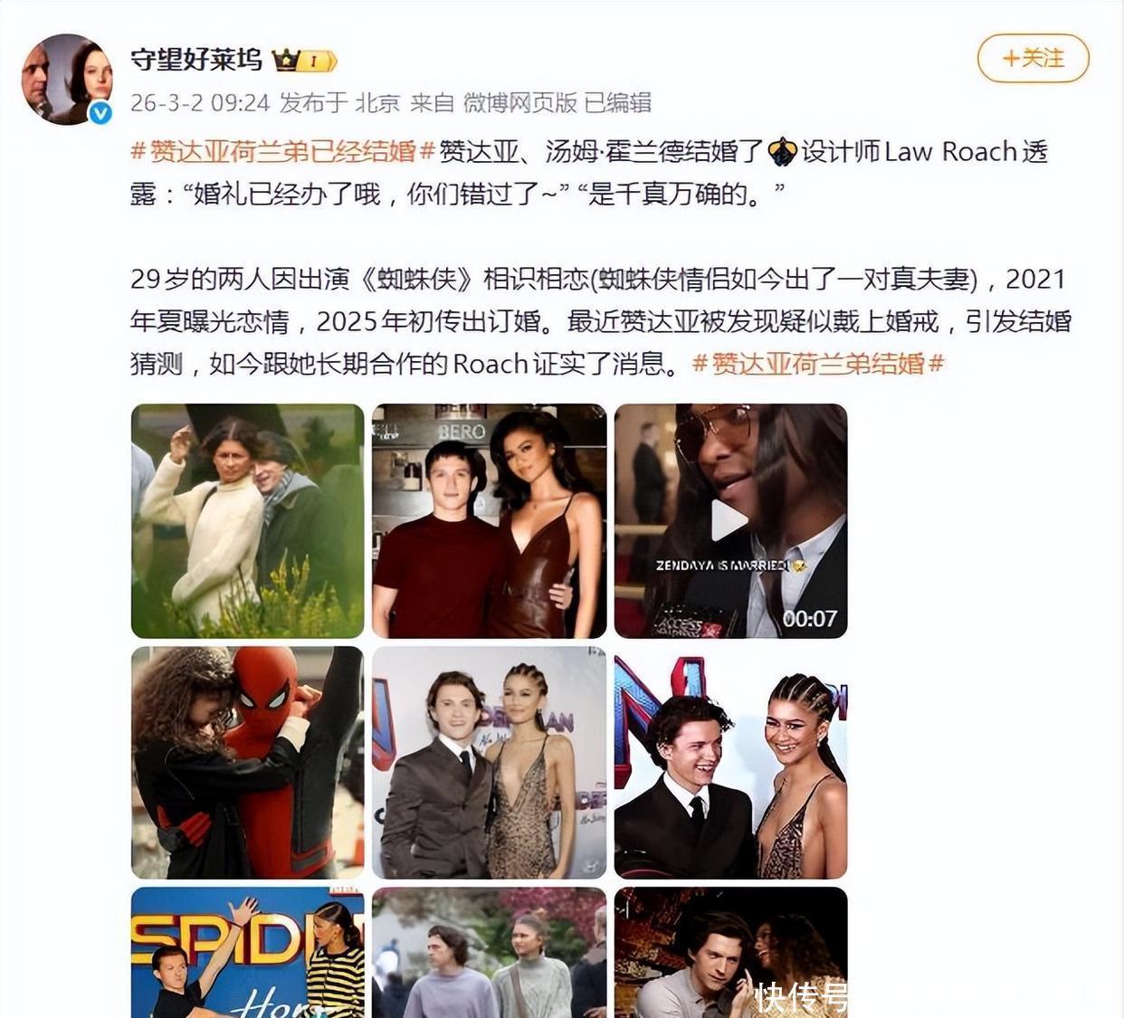“婚礼已经办了哦,你们错过了~” —— 这句来自赞达亚长期合作、关系密切的造型师劳·罗奇的亲口证实,直接给全球娱乐圈投下了一颗甜蜜炸弹。据网友3月2日爆料,罗奇在公开采访中不仅确认了赞达亚与汤姆·赫兰德(荷兰弟)已婚的“千真万确”,还透露了更多让人心痒的细节:这场婚礼极度私密,没有媒体镜头,宾客都签了保密协议,以至于他忍不住调侃,“婚纱绝美却无人得见”。